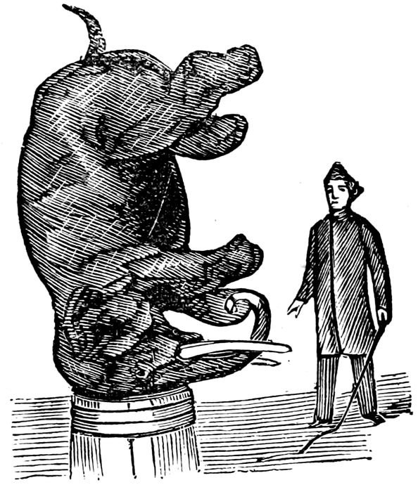 If neatly managed one of the most “taking” performances of the “arena” is the answering of questions by the horse. Yankee Robinson has a very fine animal, who replies to his master’s interrogations with much seeming judiciousness. Horses may be taught to shake and nod their heads as negative or affirmative replies, in either of two ways. The first method of training is this: Take your position at the horse’s head with a pin in your hand. Gently prick the animal’s breast. The horse bobs his head, just as he would had a fly alighted on the spot. Repeat the operation several times, each time caressing him, and perhaps rewarding him with a bit of apple occasionally. He will soon learn to nod his head on merely having the hand pointed toward his breast, or he may be trained to do the same by a motion of the foot. To teach the horse to shake his head it is only necessary to prick him slightly anywhere along the mane or over the withers. After a little teaching he will do so on your raising your hand to your head, a motion whose connection with the horse’s action will scarcely be suspected by the audience.