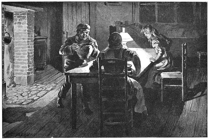 Beiden waren zooeven van school thuis gekomen en Hans zat alweer te lezen in een boek, dat hij van een der jongens ter leen had gekregen; terwijl Griete vaders pijp stopte—want zij was onuitputtelijk in kleine diensten voor den goeden man, als poogde zij te vergoeden, wat zij vroeger verzuimd had ten aanzien van den vader, voor wien ze toen bang was. Vrouw Brinker was druk bezig aan den pot: want er waren vier hongerige magen, die naar eten verlangden.