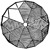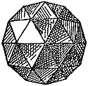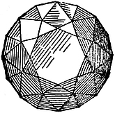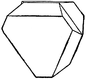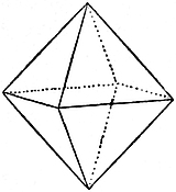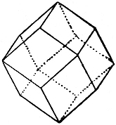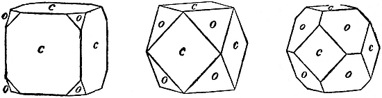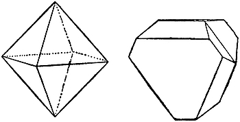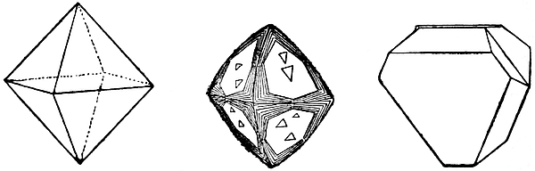 1. Cubic.—Crystals in this system can be referred to three edges, which are mutually at right angles, and in which the directional characters are identical in value. These principal edges are known9 as axes. Some typical forms are the cube (Fig. 2), characteristic of fluor; the octahedron (Fig. 3), characteristic of diamond and spinel; the dodecahedron (Fig. 4), characteristic of garnet; and the triakisoctahedron, or three-faced octahedron (Fig. 5).