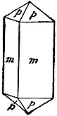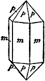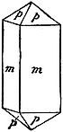 2. Tetragonal.—Such crystals can be referred to three axes, which are mutually at right angles, but in only two of them are the directional characters identical. A typical form is a four-sided prism, mm, of square section, terminated by four triangular faces, p (Fig. 6), the usual shape of crystals of zircon and idocrase.
