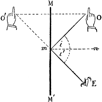 Ordinary experience with a plane mirror tells us that, when light is returned, or reflected, as it is usually termed, from a plane or flat surface, there is no alteration in the size of objects viewed in this way, but that the right and the left hands are interchanged: our right hand becomes the left hand in 15our reflection in the mirror. We notice, further, that our reflection is apparently just as far distant from the mirror on the farther side as we are on this side. In Fig. 13 MM´ is a section of the mirror, and O´ is the image of the hand O as seen in the mirror. Light from O reaches the eye E by way of m, but it appears to come from O´. Since OO´ is perpendicular to the mirror, and O and O´ lie at equal distances from it, it follows from elementary geometry that the angle i´, which the reflected ray makes with mn, the normal to the mirror, is equal to i, the angle which the incident ray makes with the same direction.