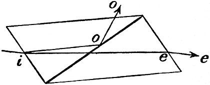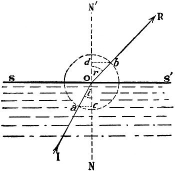 Again, everyday experience tells us that the case is less simple when light actually crosses the bounding surface and passes into the other medium. Thus, if we look down into a bath filled with water, the bottom of the bath appears to have been raised up, and a stick plunged into the water seems to be16 bent just at the surface, except in the particular case when it is perfectly upright. Since the stick itself has not been bent, light evidently suffers some change in direction as it passes into the water or emerges therefrom. The passage of light from one medium to another was studied by Snell in the seventeenth century, and he enunciated the following laws:—