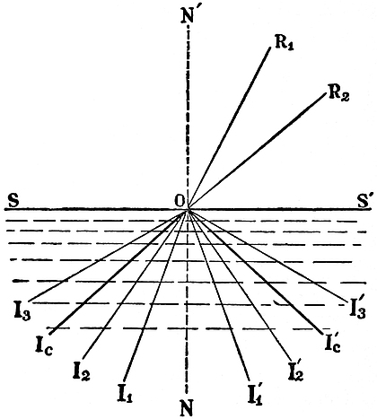 We will proceed to consider the course of rays at different angles of incidence when light passes out from a medium into one less dense—for instance, from water into air. Corresponding to light with a small angle of incidence such as I1O (Fig. 15), some of it is reflected in the direction OI´1 and the18 remainder is refracted out in the direction OR1. Similarly, for the ray I2O some is reflected along OI´2 and some refracted along OR2. Since, in the case we have taken, the angle of refraction is greater than the angle of incidence, the refracted ray corresponding to some incident, ray IcO will graze the bounding surface, and corresponding to a ray beyond it, such as I3O, which has a still greater angle of incidence, there is no refracted ray, and all the light is wholly or totally reflected within the dense medium. The critical angle IcON, which is called the angle of total-reflection, is very simply related to the refractive indices of the two media; for, since r is now a right angle, sin r = 1, and equation (a) becomes