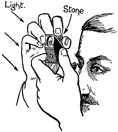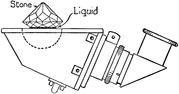 Any facet of a stone may be utilized so long as it is flat, but the table-facet is the most convenient, because it is usually the largest, and it is available even when the stone is mounted. That the stone need not be removed from its setting is one of the great advantages of this method. The smaller the stone the more difficult it is to manipulate; caution especially must be exercised that it be not tilted, not only because the shadow-edge would be shifted from its true position and an erroneous value of the refractive index obtained, but also because a corner or edge of the stone would inevitably scratch the glass of the instrument, which is far softer than the hard gem-stones. Methylene iodide will in time attack and stain the glass, and must therefore be wiped off the instrument immediately after use.