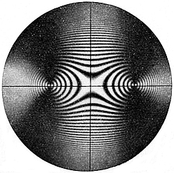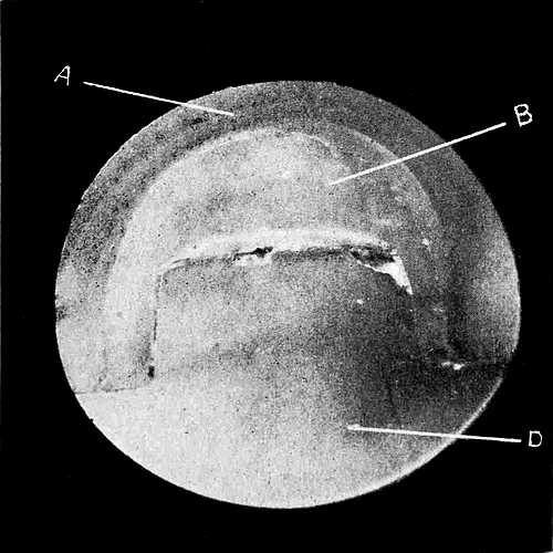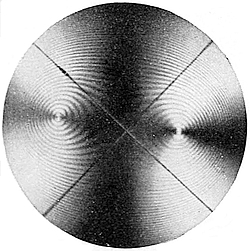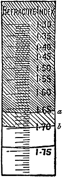 We have so far assumed that the substance which we are testing is simple and gives a single shadow-edge; but, as may be seen from Table V, many of the gem-stones are doubly refractive, and such will, in general, show in the field of the refractometer two distinct shadow-edges more or less widely separated. Suppose, for example, we study the effect produced by a peridot, which displays the phenomenon to a marked degree. If we revolve the stone so that the facet under observation remains parallel to the plane surface of the dense glass of the refractometer and in contact with it, we notice that both the shadow-edges in general move up or down the scale. In particular cases, depending upon the relation of the position of the facet selected to the crystalline symmetry, one or both of them may remain fixed, or one may even move across the other. But whatever facet of the stone be used for the test, and however variable be the movements of the shadow-edges, the highest and lowest readings obtainable remain the same; they are the principal indices of refraction, such as are stated in Table III at the end of the book, and their difference measures the maximum amount of double refraction possessed by the stone. The procedure is therefore simplicity itself; we have merely to revolve the stone on the instrument, usually through not more than a right angle, and note the greatest and least readings. It will be noticed that the shadow-edges cross the scale symmetrically in the critical and skewwise in intermediate positions. Fig. 21 represents the effect when the facet is such as to give simultaneously29 the two readings required. The shadow-edges a and b, which are coloured in white light, correspond to the least and greatest respectively of the principal refractive indices, while the third shadow-edge, which is very faint, corresponds to the liquid used—methylene iodide. It is possible, as we shall see in a later chapter, to learn from the motion, if any, of the shadow-edges something as to the character of the double refraction. Since, however, each shadow-edge is spectral in white light, they will not be distinctly separate unless the double refraction exceeds the relative dispersion. Topaz, for instance, appears in white light to yield only a single shadow-edge, and may thus easily be distinguished from tourmaline, in which the double refraction is large enough for the separation of the two shadow-edges to be clearly discerned. In sodium light, however, no difficulty is experienced in distinguishing both the shadow-edges given by substances with small amount of double refraction, such as chrysoberyl, quartz, and topaz, and a skilled observer may detect the separation in the extreme instances of apatite, idocrase, and beryl. The shadow-edge corresponding to the greater refractive index is always less distinct, because it lies in the bright portion of the field. If the stone or its facet be small, it must be moved on the plane surface of the dense glass until the greatest possible distinctness is imparted to the30 edge or edges. If it be moved towards the observer from the further end, a misty shadow appears to move down the scale until the correct position is reached, when the edges spring into view.