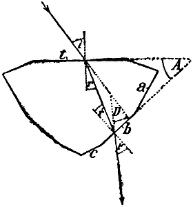 Fig. 22 represents a section of a step-cut stone perpendicular to a series of facets with parallel edges; t is the table, and a, b, c, are facets on the culet side. The path of light traversing the prism formed by the pair of facets, t and b, is indicated. Suppose that A is the interior angle of the prism, i the angle of incidence of light at the first facet and i´ the angle of emergence at the second facet, and r and r´ the angles inside the stone at the two facets respectively. Then at the first facet light has been bent through an angle i - r, and again at the second facet through an angle i´ - r´; the angle of deviation, D, is therefore given by