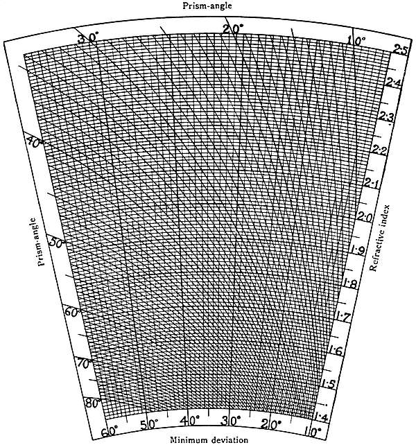 THE methods available for the measurement of refractive indices are of two kinds, and make use of two different principles. The first, which is based upon the very simple relation found in the last chapter to subsist at total-reflection, can be used with ease and celerity, and is best suited for discriminative purposes; but it is restricted in its application. The second, which depends on the measurement of the angle between two facets and the minimum deviation experienced by a ray of light when traversing a prism formed by them, is more involved, entails the use of more elaborate apparatus, and takes considerable time, but it is less restricted in its application.
