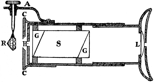 If the stone be too highly refractive for a measurement of its refractive index to be possible with the refractometer just described, and it is desired to determine this constant, recourse must be had to the prismatic method, for which purpose an instrument known as a goniometer[3] is required. 31Two angles must be measured; one the interior angle included between a suitable pair of facets, and the other the minimum amount of the deviation produced by the pair upon a beam of light traversing them.