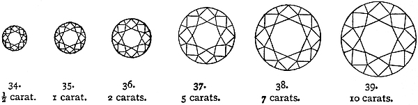 The diagram on Plate II and most of the crystal drawings were made by me. The remaining drawings are the work of Mr. H. H. Penton. He likewise prepared the coloured drawings of cut stones which appear on the three coloured plates, his models, with two exceptions, being selected from the cut specimens in the Mineral Collection of the British Museum by permission of the Trustees. Unfortunately, the difficulties that still beset the reproduction of pictures in colour have prevented full justice being done to the faithfulness of his brush. I highly appreciate the interest he took in the work, and the care and skill with which it was executed. My thanks are due to the De Beers Consolidated Mines Co. Ltd., and to Sir Henry A. Miers, F.R.S., Principal of theviii University of London, for the illustrations of the Kimberley and Wesselton diamond mines, and of the methods and apparatus employed in breaking up and concentrating the blue ground; to Messrs. I. J. Asscher & Co. for the use of the photograph of the Cullinan diamond; to Mr. J. H. Steward for the loan of the block of the refractometer; and to Mr. H. W. Atkinson for the illustration of the diamond-sorting machine. My colleague, Mr. W. Campbell Smith, B.A., has most kindly read the proof-sheets, and has been of great assistance in many ways. I hope that, thanks to his invaluable help, the errors in the book which may have escaped notice will prove few in number and unimportant in character. To Mr. Edward Hopkins I owe an especial debt of gratitude for his cheerful readiness to assist me in any way in his power. He read both the manuscript and the proof-sheets, and the information with regard to the commercial and practical side of the subject was very largely supplied by him. He also placed at my service a large number of photographs, some of which—for instance, those illustrating the cutting of stones—he had specially taken for me, and he procured for me the jewellery designs shown on Plates IV and V.