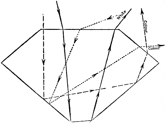 Upon the fact that the refractive index of a20 substance varies for light of different colours depends such familiar phenomena as the splendour of the rainbow and the ‘fire’ of the diamond. When white light is refracted into a stone it no longer remains white, but is split up into a spectrum. Except in certain anomalous substances the refractive index increases progressively as the wave-length of the light decreases, and consequently a normal spectrum is violet at one end and passes through green and yellow to red at the other end. The width of the spectrum, which may be measured by the difference between the refractive indices for the extreme red and violet rays, also varies, though on the whole it increases with the refractive index. It is the dispersion, as this difference is termed, that determines the ‘fire’—a character of the utmost importance in colourless transparent stones, which, but for it, would be lacking in interest. Diamond excels all colourless stones in this respect, although it is closely followed by zircon, the colour of which has been driven off by heating; it is, however, surpassed by two coloured species: sphene, which is seldom seen in jewellery, and demantoid, the green garnet from the Urals, which often passes under the misnomer ‘olivine.’ The dispersion of the more prominent species for the B and G lines of the solar spectrum is given in Table IV at the end of the book.