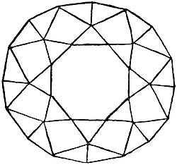 Crystals are often not single separate individuals. For instance, diamond and spinel are found in flat triangular crystals with their girdles cleft at the corners (Fig. 12). Each of such crystals is really composed of portions of two similar octahedra, which are placed together in such a way that each is a reflection of the other. Such composite crystals are called twins or macles. Sometimes the twinning is repeated, and the individuals may be so minute as to call for a microscope for their perception.