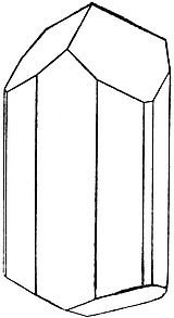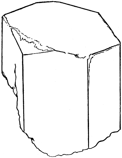 3. Hexagonal.—Such crystals can be referred alternatively either to a set of three axes, X, Y, Z (Fig. 7), which lie in a plane perpendicular to a fourth, H, and are mutually inclined at angles of 60°, or to a set of three, a, b, c, which are not at right angles as in the cubic system, but in which the directional characters are identical. The fourth axis in the first arrangement is equally inclined to each in the second set of axes. Many important species crystallize in this system—corundum (sapphire, ruby), beryl (emerald, aquamarine), tourmaline, quartz, and phenakite. The crystals usually display a six-sided prism, terminated by a single face, c, perpendicular to the edge of the prism m (Fig. 8), e.g. emerald, or by six or twelve inclined faces, p (Fig. 9), e.g. quartz, crystals of which are11 so constant in form as to be the most familiar in the Mineral Kingdom. Tourmaline crystals (Fig. 10) are peculiar because of the fact that often one end is obviously to the eye flatter than the other.