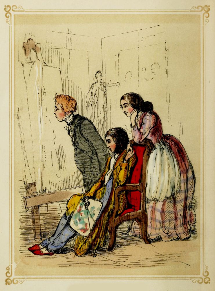 Fondness for art leads me a great deal to this studio. George is a gentleman, and has very good friends, and good pluck too. When we were at Rome there was a great row between him and young Heeltap, Lord Boxmoor’s son, who was uncivil to Miss Rumbold; (the young scoundrel—had I been a fighting man I should like to have shot him myself!) Lady Betty Bulbul is very fond of Clara, and Tom Bulbul, who took George’s message to Heeltap, is always hanging about the studio. At least I know that I find the young jackanapes there almost every day; bringing a new novel, or some poisonous French poetry, or a basket of flowers, or grapes, with Lady Betty’s love to her dear Clara—a young rascal with white kids, and his hair curled every morning. What business has he to be dangling about George Rumbold’s premises, and sticking up his ugly pug-face as a model for all George’s pictures?