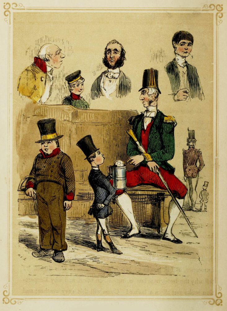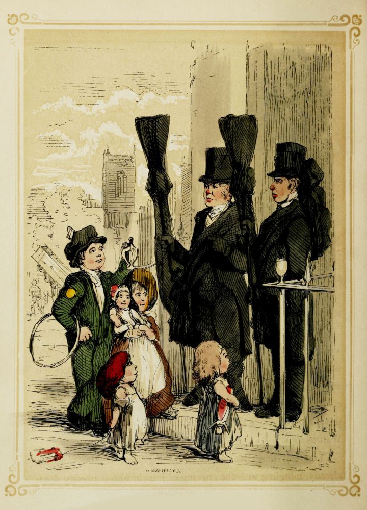 The last boy in the sketch, 6, need scarcely be particularized. Doctor’s boy; was a charity boy; stripes evidently added on to a pair of the doctor’s clothes of last year—Miss Clapperclaw pointed this out to me with a giggle.—Nothing escapes that old woman.