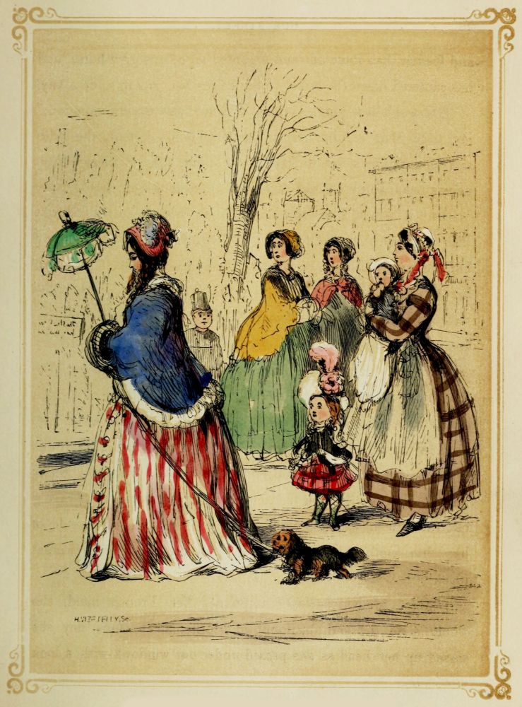The very first day on which an intimate and valued female friend of mine saw Mrs. Stafford Molyneux stepping into a Brougham, with a splendid bay horse, and without a footman (mark, if you please, that delicate sign of respectability), and after a moment’s examination of Mrs. S. M.’s toilette, her manners, little dog, carnation-coloured parasol, &c., Miss Elizabeth Clapperclaw clapped to the opera-glass with which she had been regarding the new inhabitant of Our Street, came away from the window in a{27} great flurry, and began poking her fire in a fit of virtuous indignation.