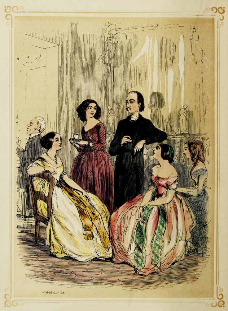 His little wife was charming—to see her in pink, with some miniature Dixons in pink too, round about her, or in that beautiful grey dress, with the deep black lace flounces, which she wore at my Lord Comandine’s on the night of the private{32} theatricals, would have done any man good. To hear her sing any of my little ballads, “Know’st thou the Willow-tree?” for instance, or “The Rose upon my balcony,” or “The Humming of the Honey-bee” (far superior, in my judgment, and in that of some good judges likewise, to that humbug Clarence Bulbul’s ballads)—to hear her, I say, sing these, was to be in a sort of small Elysium. Dear, dear, little Fanny Dixon! she was like a little chirping bird of Paradise. It was a shame that storms should ever ruffle such a tender plumage.