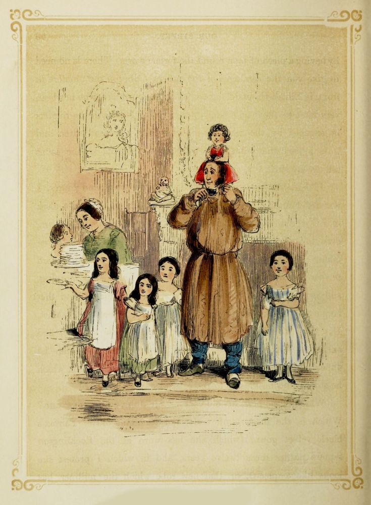 Early in the morning Mrs. Fairfax rises, and cuts bread and butter from six o’clock till eight; during which time the nursery operations upon the nine little graces are going on. We only see a half dozen of them at this present moment, and in the present authentic picture, the remainder dwindling off upon little chairs by their mamma.