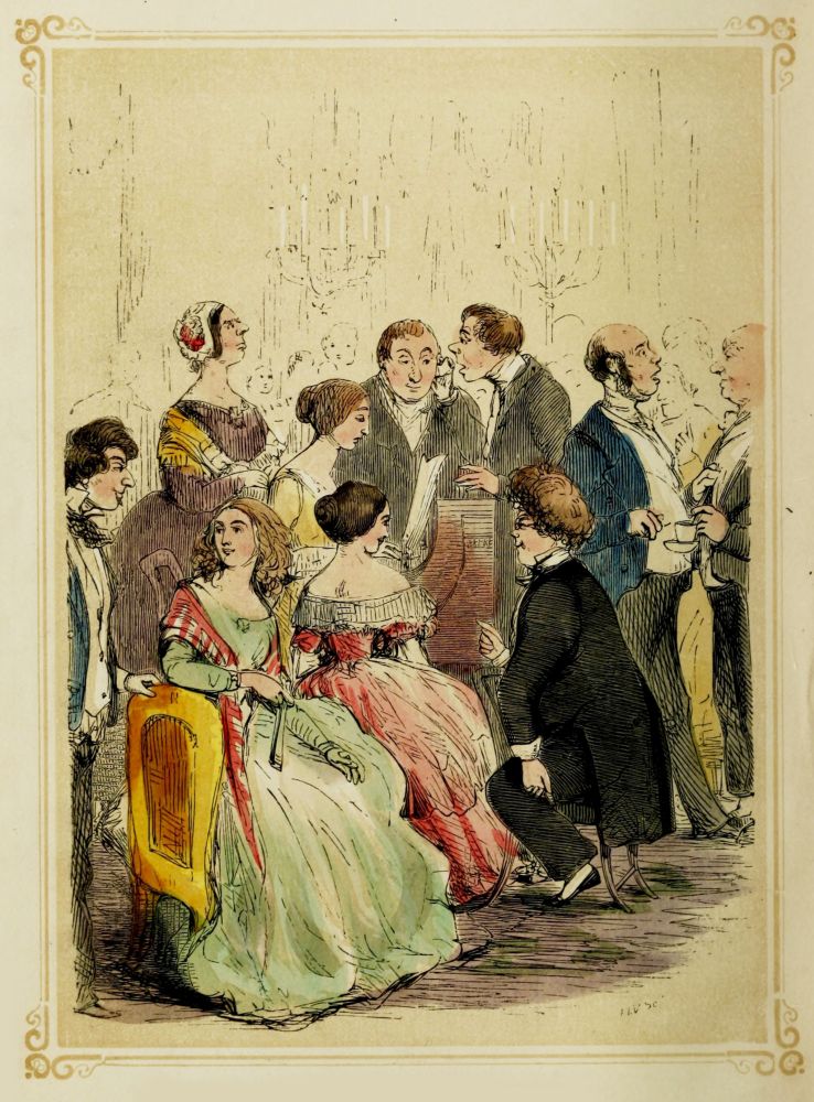 How different it is with the Newboys, now, where I have an entrée—(having indeed had the honour in former days to give lessons to both the ladies)—and where such a quack as Pinkney would never be allowed to enter! A merrier house the whole quarter cannot furnish. It is there you meet people of all ranks and degrees, not only from our quarter but from the rest of the town. It is there that our great man, the Right Honourable Lord Comandine, came up and spoke to me in so encouraging a manner that I hope to be invited to one of his lordship’s excellent dinners (of which I shall not fail to give a very flattering description) before the season is over. It is there you find yourself talking to statesmen, poets, and artists—not sham poets like Bulbul, or quack artists like that Pinkney—but to the best members of all society. It is there I made the sketch in the frontispiece while Miss Chesterforth was singing a deep-toned tragic ballad, and her mother scowling behind her. What a buzz and clack and{47} chatter there was in the room to be sure! When Miss Chesterforth sings everybody begins to talk. Hicks and old Fogy were on Ireland; Bass was roaring into old Pump’s ears (or into his horn rather) about the Navigation Laws; I was engaged talking to the charming Mrs. Short; while Charley Bonham (a mere prig, in whom I am surprised that the women can see anything) was pouring out his fulsome rhapsodies in the ears of Diana White. Lovely, lovely Diana White! were it not for three or four other engagements, I know a heart that would suit you to a T.