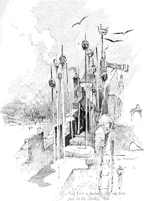 | “And now a shocking Sight was to be seen at the Bridge Gate.” Drawn by Herbert Railton |