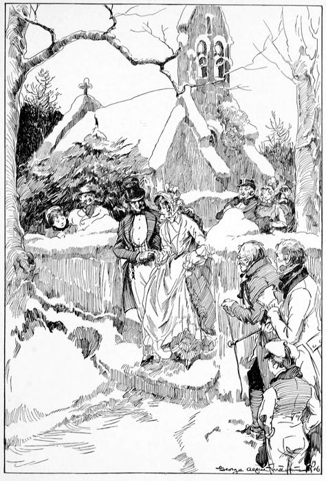 The arrival of the two new visitors, and the consequent check upon Mr. Winkle and the young lady with the fur round her boots, would in all probability have proved a very unpleasant interruption to the hilarity of the party, had not the cheerfulness of Mr. Pickwick, and the good humour of the host, been exerted to the very utmost 127for the common weal. Mr. Winkle gradually insinuated himself into the good graces of Mr. Benjamin Allen, and even joined in a friendly conversation with Mr. Bob Sawyer; who, enlivened with the brandy, and the breakfast, and the talking, gradually ripened into a state of extreme facetiousness, and related with much glee an agreeable anecdote, about the removal of a tumour on some gentleman’s head, which he illustrated by means of an oyster-knife and a half-quartern loaf, to the great edification of the assembled company. Then the whole train went to church, where Mr. Benjamin Allen fell fast asleep; while Mr. Bob Sawyer abstracted his thoughts from worldly matters, by the ingenious process of carving his name on the seat of the pew, in corpulent letters of about four inches long.