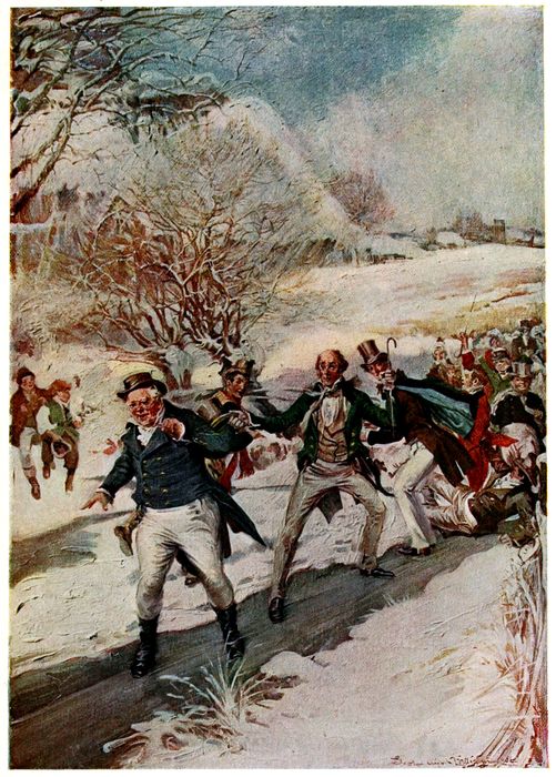 Meanwhile, Mr. Pickwick and his friends having walked their blood into active circulation, proceeded cheerfully on; the paths were hard, the grass was crisp and frosty, the air had a fine, dry, bracing coldness, and the rapid approach of 41the grey twilight (slate-coloured is a better term in frosty weather) made them look forward with pleasant anticipation to the comforts which awaited them at their hospitable entertainer’s. It was the sort of afternoon that might induce a couple of elderly gentlemen, in a lonely field, to take off their great coats and play at leap-frog in pure lightness of heart and gaiety; and we firmly believe that had Mr. Tupman at that moment proffered “a back,” Mr. Pickwick would have accepted his offer with the utmost avidity.