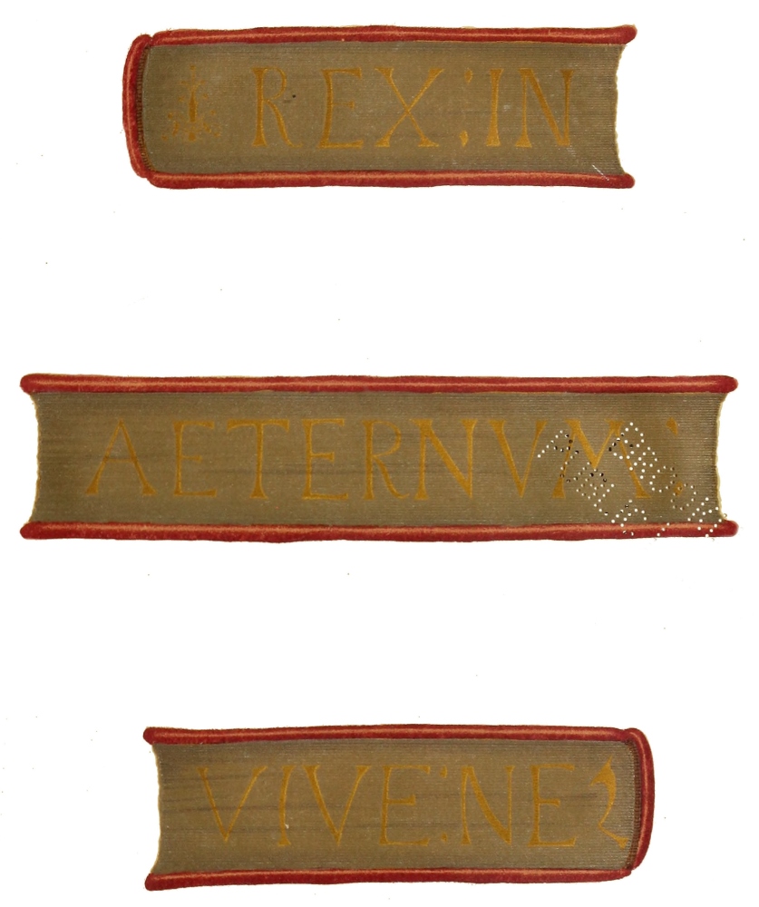 “Rex in Aeternum Vive.” Painted in gold on the edges of bindings by T. Berthelet, 66, 74, 78, 79