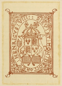 During the reign of Henry VIII. some large heraldic panel stamps bearing the royal coat of arms were made here, probably by Dutch workmen, as they have characteristics of foreign workmanship. These stamps are often considered royal, but it is doubtful whether they ever were so. Two of them bear the royal coat of arms as used by Henry VII. and Henry VIII. One shows the royal coat, crowned, with supporters, stars, and a few flowers, and at the top the sun in glory and a half-moon with a face in profile, the arms of the City of London, and the cross of St. George; the other, a handsomer design, has likewise the royal coat of arms, crowned, with supporters, but at the top there are two angels carrying scrolls, and having between them a large double rose, while below are two portcullises, depending from the lower edge of the shield by chains. Two other panel stamps belonging to this series show the coats of arms of Queen Katharine of Aragon and Queen Anne Boleyn, and these have large shields, crowned, and supported by angels, with a ground on which are several flower sprays.