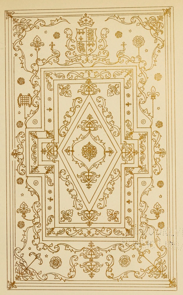 Immediately after the general discontinuance of large panel stamps with royal heraldic designs, Thomas Berthelet became royal{26} printer and binder to Henry VIII., and the earliest of his large stamps bears some resemblance to the stamp just described as having two portcullises dependent from the lower part of the shield. It is possible that Berthelet took his design from this stamp. But whatever Berthelet’s early bindings may have been like, the distinguishing characteristic of his work is the gold-tooling, properly so called, which he was, so far as is yet known, the first Englishman to use. A large portion of the printing he did was in the form of proclamations, single sheets, and other official matters, which were never bound; but as time went on, and the king, with his Tudor love of magnificence, perhaps to some extent regretting his own destruction of the beautiful and valuable Mediæval bindings, feeling that something more ornamental than the sombre panel stamps was wanted, Berthelet, being already royal printer, was no doubt further commissioned to make decorative royal bindings. This he did on both velvet and satin, materials already royal favourites, as well as using his new art of leather gilding in as decorative a manner as possible.{27}