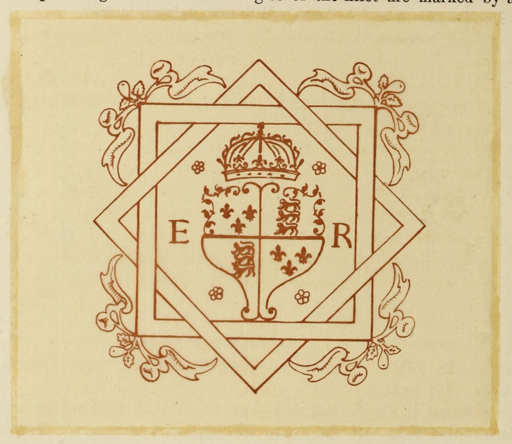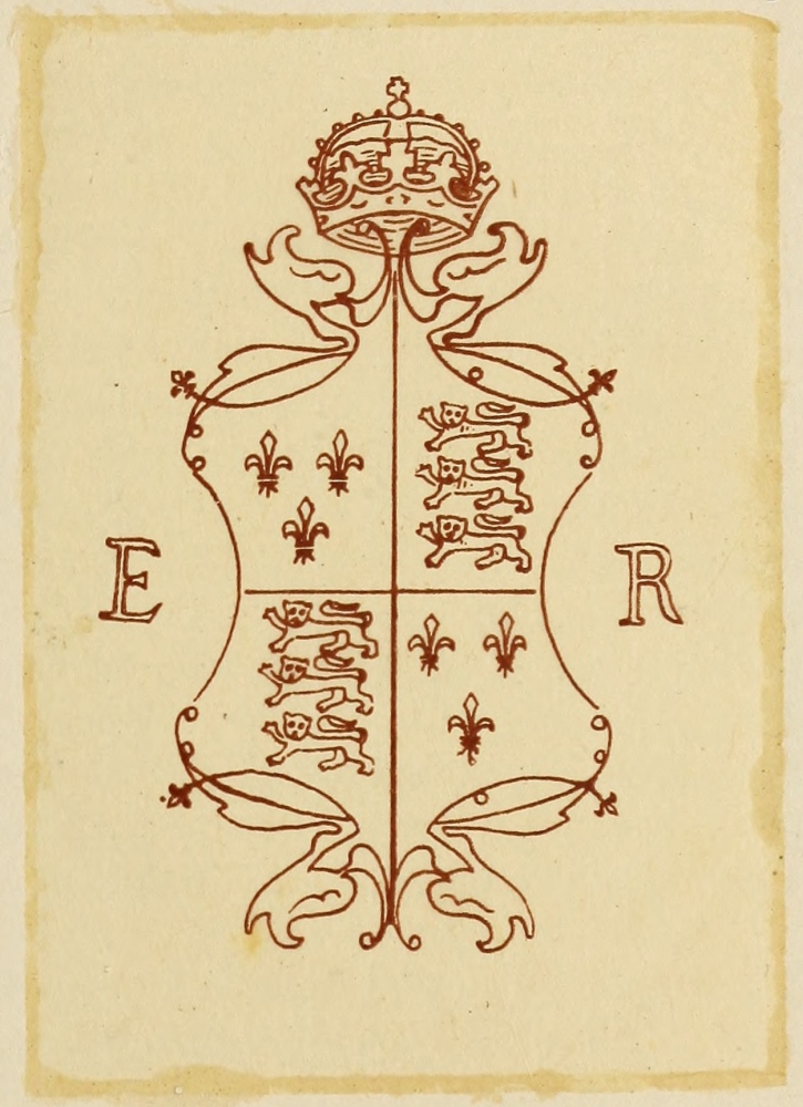 The royal heraldry at the time Berthelet made his bindings was simple and dignified; first and fourth were the three fleurs-de-lys of France; second and third, the three lions of England. From William the Conqueror until Henry II., the royal coat of England probably consisted of two lions passant guardant in pale. Henry II., however, on his marriage with Eleanor, daughter of William V., Duke of Aquitaine and Guienne, incorporated the coat of that potentate, a single leopard, with his own, but as he probably considered the conjunction of this animal with those already on his coat might not be conducive to peace, he turned the leopard into a similar lion and added it to the others, and from that time the coat of arms of England has been “gules, three lions passant guardant in pale, or.” The coat of France, “azure, semé de fleurs-de-lys, or,” was adopted by Edward III., in the fourteenth year of his reign, together with the title of King of France, asserting his right to the coat and the title by virtue{23} of his mother, Isabel, daughter of Philip IV. At first Edward placed the French coat in the second and third places of his shield, but presently gave it the places of honour, first and fourth, in consequence of a remonstrance from the French king. Edward’s grandson, Richard II., married, as his second wife, Isabel, daughter of Charles VI. of France, who changed his coat, “semé de fleurs-de-lys,” to one having only three fleurs-de-lys. Richard altered the French coat on his shield in accordance with this change, and this became the royal coat of arms of England until the accession of James I. With regard to the supporters which are found on some of Berthelet’s bindings, they are only the dragon and the greyhound. The dragon is the red dragon of the last of the British kings, Cadwallader, from whom Henry VII. claimed descent, and in remembrance of whom he bore it as a supporter, as did all our Tudor sovereigns. This, however, is only one explanation, as it appears that a very similar badge was previously borne by Henry III., Edward I., and Edward III. The greyhound was also one of Henry VII.’s supporters, and is found on several of his bindings; it was used by Henry VIII. until about 1528, when he substituted a lion and changed the sides. This greyhound was borne by Henry VII. by a double right, partly by reason of his own descent from the Earls of Somerset, whose badge it was, and also by right of his wife through the Nevilles.