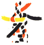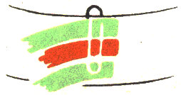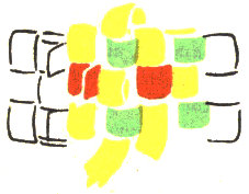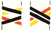 The pattern shown above is made with three colors according to the direction illustrations. Checkerboard patterns are made by using one color on the band and a second color for weaving. Four more two-color patterns are made by placing the lighter color at the center of the band or at the edge, and by using a dark or a light weaving strand. Three-color patterns have six additional possibilities for variation on the same principle.
