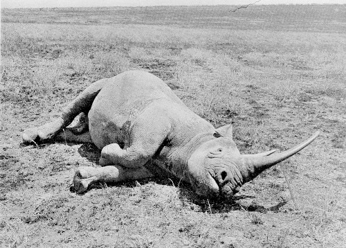 I had some personal experiences with animals in the forest, which added a little excitement to the journeys. On one occasion as we were 274going along some of the boys pointed into the bush, saying, “Yama,” which is the Swahili word for meat, and is applied indiscriminately to any animal. It was getting dusk, and, peering into the bush, I could see something dark moving, but not being able in the half-darkness to see what it was, I thought that the best thing to do was to try the effect of a bullet on it. I had no sooner fired than the animal charged out on me, and I saw that it was a huge rhinoceros. Having only soft-nosed bullets, my shot had not injured it, and as it was only about ten paces from where I was standing I had only just time to spring out of the way before it blundered past me. Immediately every man dropped his load and sprang up the nearest tree, while the rhino, after passing me, slowed down and began sniffing about among the loads which the porters had thrown to the ground in their hurry to get to places of safety. Although I knew that unless I could hit him in a vulnerable spot it was no use firing, I gave him a few shots at random, which had the effect of driving him off.