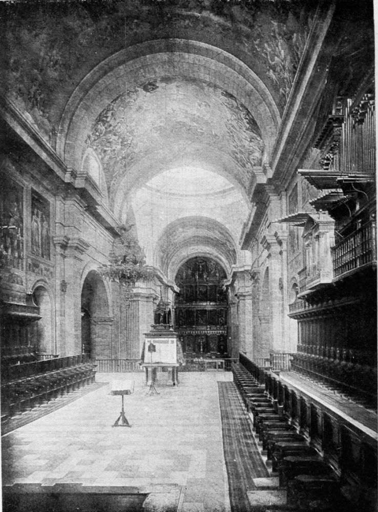 The Escorial reflects the genius of Spain at the period following upon the final emancipation from the sway of the Moors. It is an image, as it were, of the powerful monarch who founded it, and spent so many years of his life in superintending the construction and decoration of the building. The Real Monasterio de San Lorenzo del Escorial is a repository of many of the world’s masterpieces of art, a library of rare and costly manuscripts and volumes, a sumptuous hermitage, a college, and a sanctuary. It is one of the{viii} wonders of Spain, and among the most historically interesting royal residences in Europe. With the aid of the letterpress and the illustrations included here, those readers who have not visited the Escorial will, I trust, be enabled to realise something of its massive grandeur, and to appreciate its significance in the history of the Spanish nation; while those who propose to inspect this ‘Leviathan of Architecture’ will find these pages useful in directing their attention to the chief works of art and objects of interest.