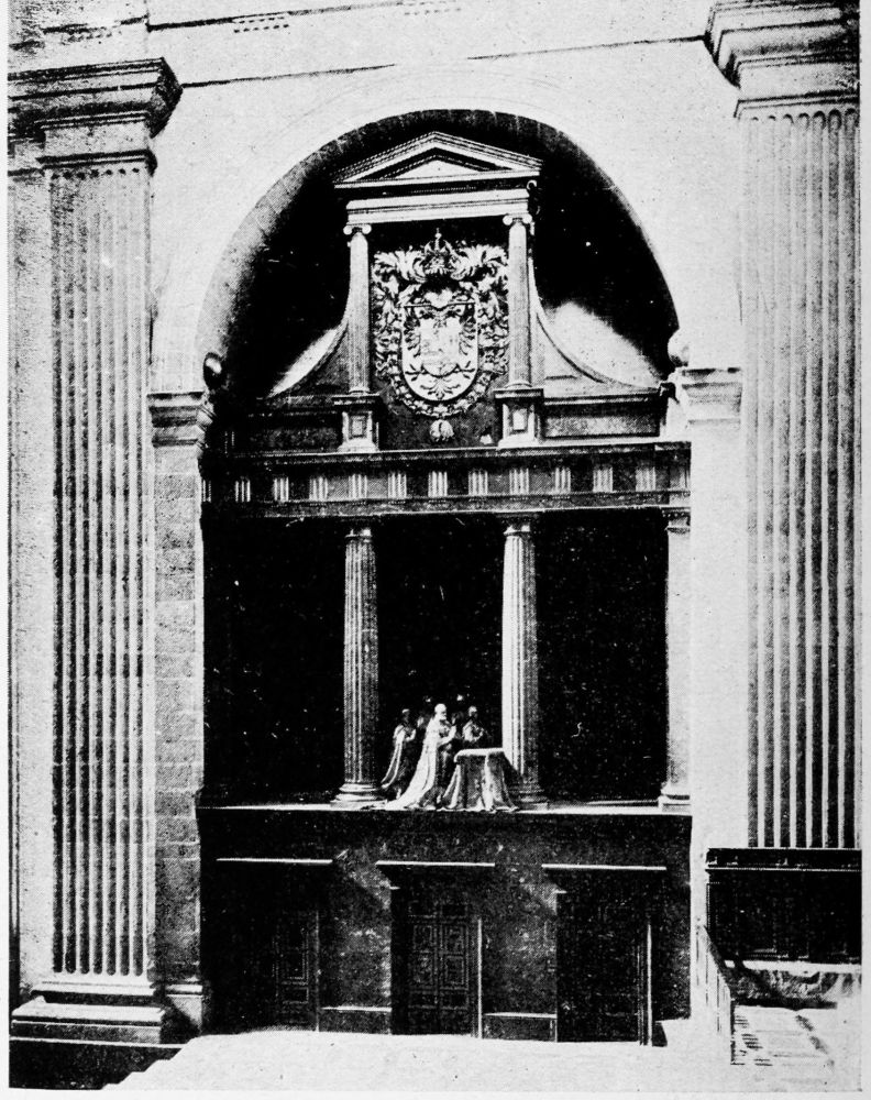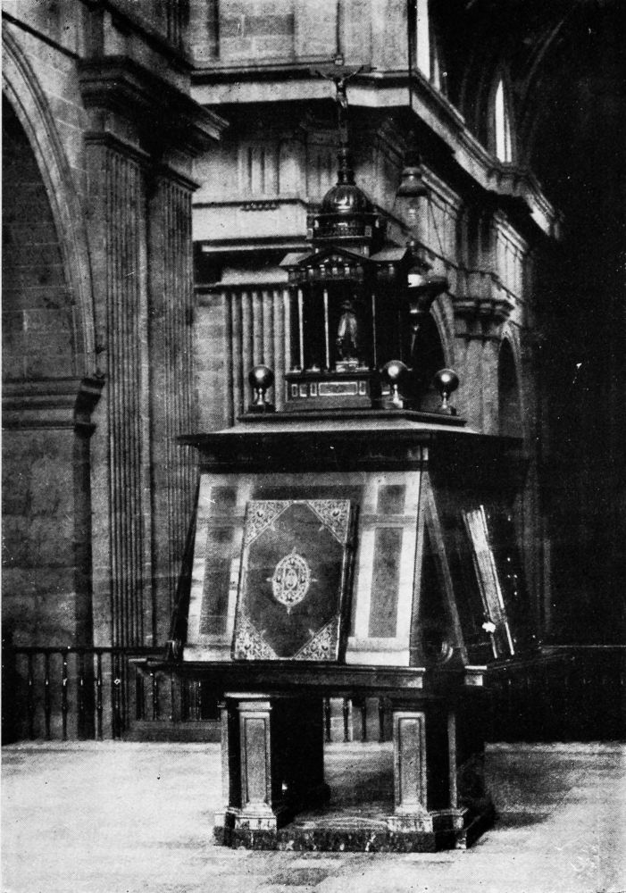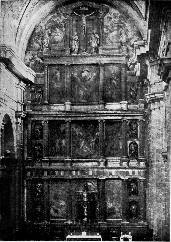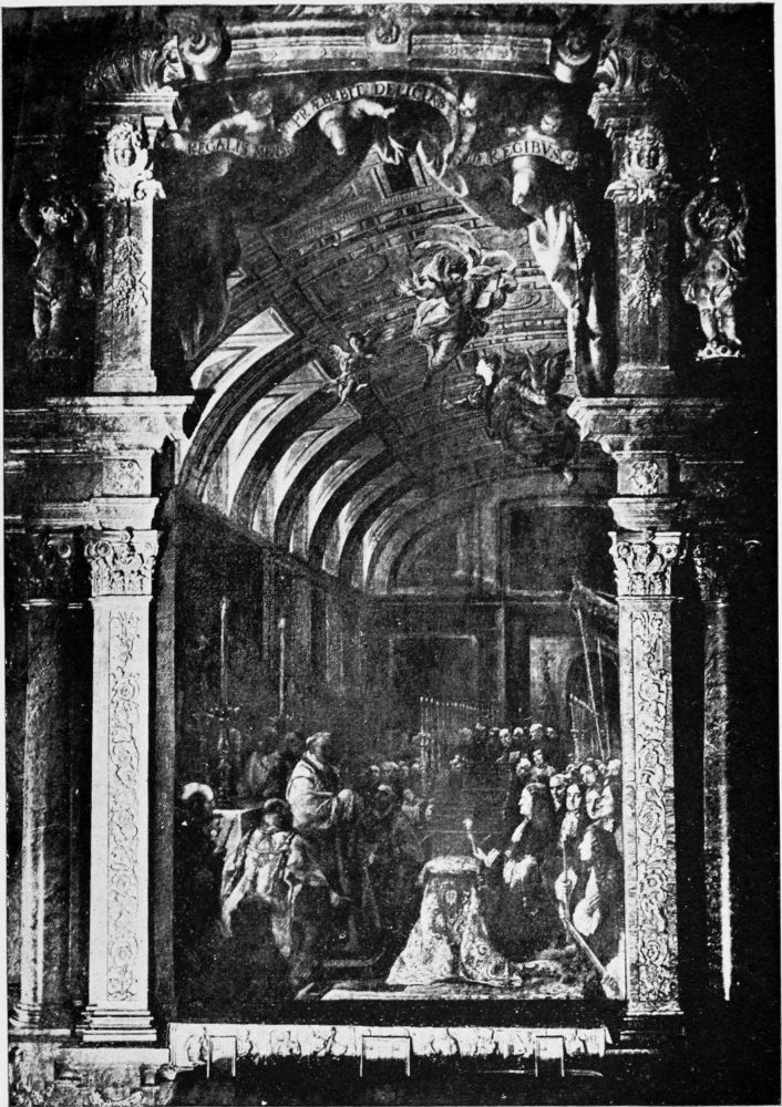 In 1586 the king was busy with preparations for the ceremony of consecrating the church of the Escorial, which had been completed some time previously. During the erection of the church, services were held in a temporary structure, and in this building there was a celebration of the mass before the procession{15} entered the new church. Philip, the prince, and several great clerics supported the canopy which was carried in the solemn pageant. The temporary church, which stood in the hamlet, was afterwards reconstructed, and placed at the service of the people.