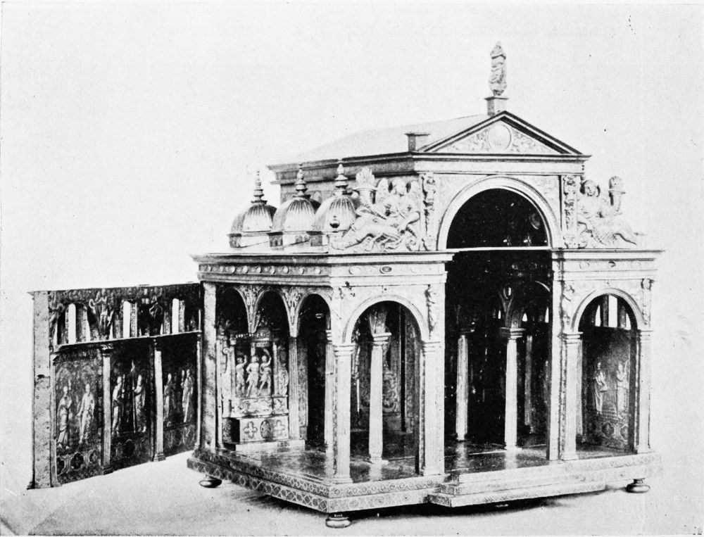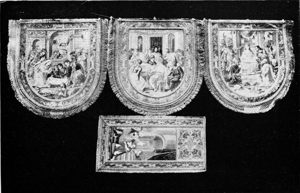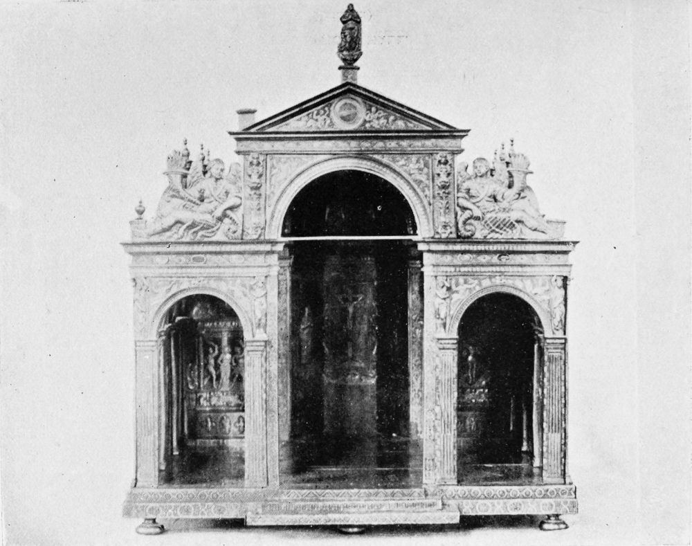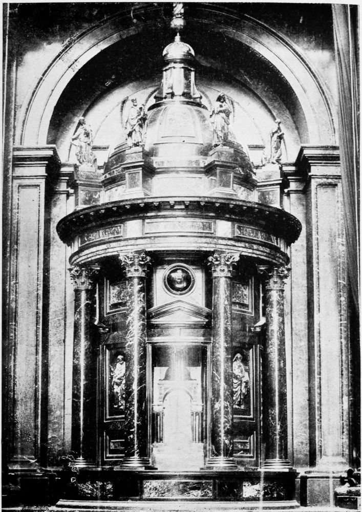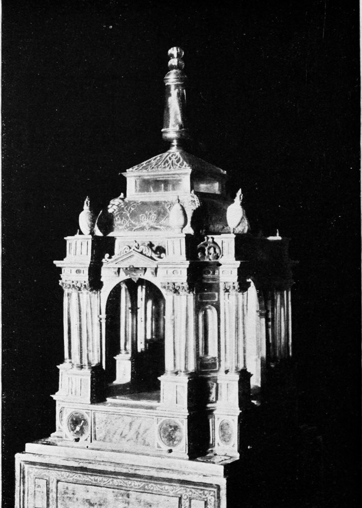 In 1586 the king was busy with preparations for the ceremony of consecrating the church of the Escorial, which had been completed some time previously. During the erection of the church, services were held in a temporary structure, and in this building there was a celebration of the mass before the procession{15} entered the new church. Philip, the prince, and several great clerics supported the canopy which was carried in the solemn pageant. The temporary church, which stood in the hamlet, was afterwards reconstructed, and placed at the service of the people.