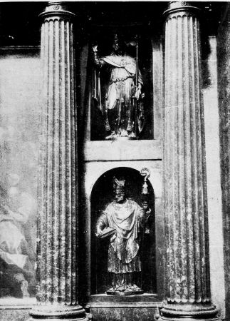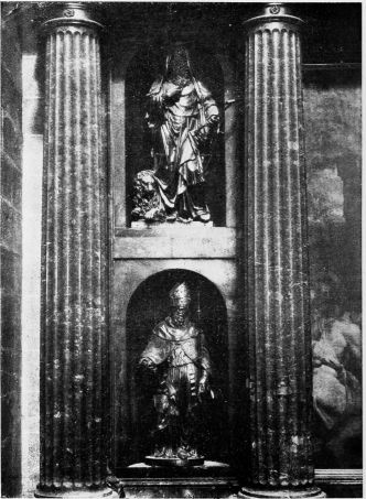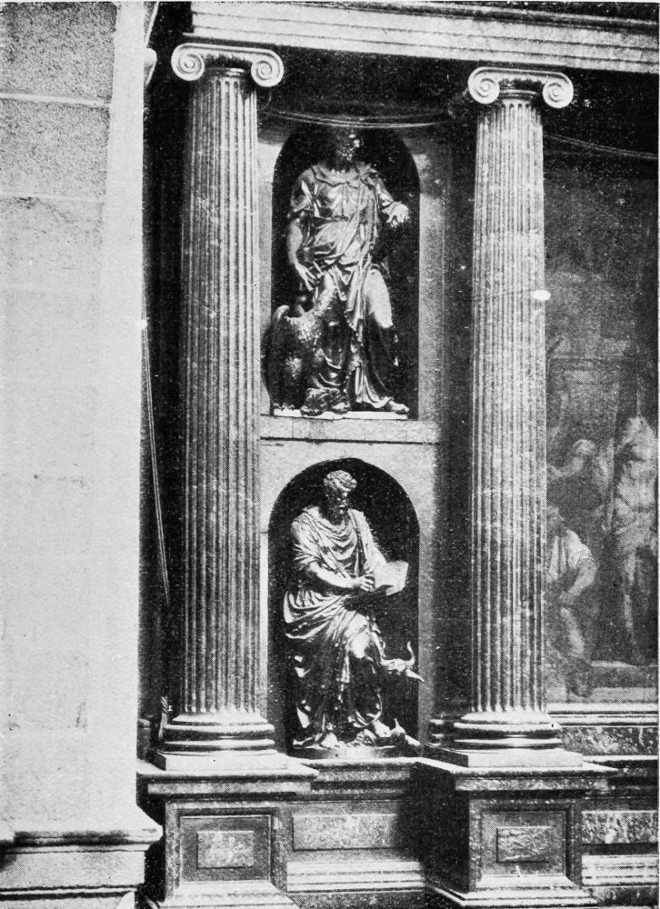 Monegro’s figure of San Lorenzo, huge, and carved in stone, stands above the door. The head and the hands are of Andalusian marble. Monegro is said to have asked the sum of 20,900 reales for carving this effigy, and other 7700 reales for the arms of Spain carved below the statue.