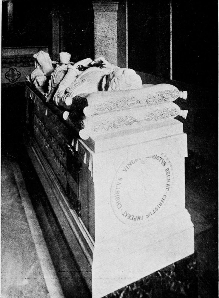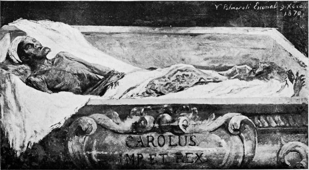 In 1570 Philip married for the fourth time, his bride being Anne of Austria. A year later the queen gave birth to Fernando, who died at Madrid at the age of seven, and was buried in the Escorial. The body of Don John of Austria, natural brother of Philip, was interred beneath the altar of the{13} church in the following year. In 1574 the remains of the illustrious Emperor Charles were transferred to the vaults of the Escorial with much ceremony, and at the same time several other royal coffins were removed to the newly-made royal resting-place. During the solemn service a terrific storm destroyed the dais which had been erected for the ceremony, and the splendid trappings that covered it.