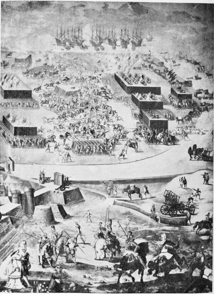 The French general was the Duke de Nevers, who was assisted by the Constable of France, Montmorency. To Coligni, the great admiral, was given the task of augmenting the garrison of St. Quintin. The troops of France were nevertheless greatly outnumbered by the Spanish forces. Flemings, Englishmen, and Spaniards, in{7} combined array, made desperate assault upon the defenders of St. Quintin. In a last rally the French formed squares, but the artillery of the Duke of Savoy broke up their ranks. Montmorency was among the prisoners who were seized by the Spanish, and it is recorded that he was treated with considerate courtesy.