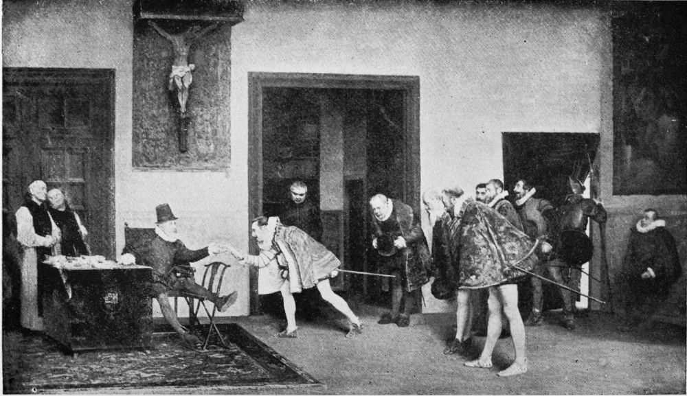 So died the Founder of the Escorial, and the initiator of the great work which the Spanish people claimed as one of the chief wonders of the world. He had lived to see the realisation of his desire. Year by year he had watched the development of his plans, the building of the monastery, the uplifting of the church, and the establishment of a court and a college in this remote Castilian highland. The hours of his retirement had been devoted to the gratification of his taste in the arts, to contemplation, and to penance. Like Solomon, he had surrounded himself with objects of priceless worth, and he passed his days in an atmosphere of beauty. Æsthetic, and at the same time ascetic, Philip seemed possessed of a dual nature in which rival forces constantly contended. If his mind was marked by gloom, it was relieved by his passion for art and by his love of the simple pleasures{17} of a country life. Nor was the king apparently devoid of a capacity for enjoying occasionally the conventional gaieties of life, for among his numerous retinue, he maintained a fool, or royal jester, one Miguel D’Antona, a grotesque dwarf, with an ugly, humorous countenance.
