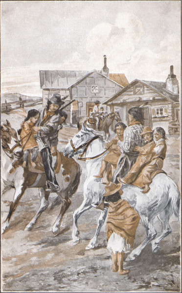 Wir beide setzten uns auf die Schwelle der Haustür und warteten auf das, was kommen werde. Wir sprachen darüber, ob die Indianer wohl zurückkommen und ihre Kinder bringen würden und hatten so unsere Bedenken. Wir mochten wohl eine gute Stunde gewartet haben, da sahen wir etliche Reiter kommen. Es waren ihrer drei. Sie hatten es nicht sehr eilig. Jetzt kamen sie näher. Wir konnten erkennen, daß es Polizisten waren und sahen auch, daß sie nicht allein auf ihren Pferden saßen. Jeder von den dreien hatte ein paar Kinder hinter sich sitzen — zwei von ihnen hatten je zwei Kinder, der dritte sogar drei. Im ganzen waren es sieben Kinder, zwei Mädchen und fünf Knaben.