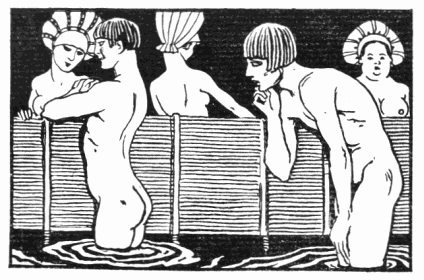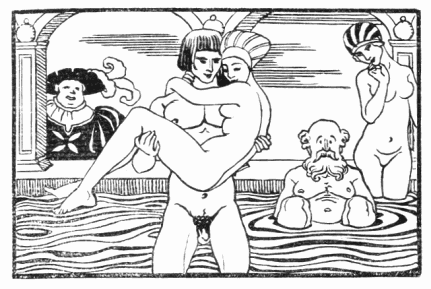 Il paraît que les baigneurs y étaient surtout des gens pleins de santé «en quête de sensations d'amour et de voluptueuses impressions: les amants, les galants, les femmes sensuelles, les stériles…». «Ces gens-là, dit Pogge, n'ont assurément jamais étudié les hautes fantaisies d'Héliogabale: la nature seule les a instruits, si bien instruits qu'ils sont passés maîtres en sciences amoureuses.» Il croit revoir les Jeux floraux de Rome aux bains publics où toutes les femmes sont nues. Mais rien n'est plus divertissant que les bains particuliers où «les sexes sont séparés par des cloisons criblées de petits trous et fenêtres par où l'on passe des rafraîchissements, l'on cause et se caresse de la main selon une habitude favorite… C'est un spectacle bien provoquant, ajoute-t-il, de voir des jeunes vierges, dans toute la maturité de leur jeunesse, montrer leurs formes splendides sous le costume des déesses… Quand elles dansent ainsi, avec leurs légères draperies de lin voltigeant en arrière ou flottant sur l'eau… on leur jette des pièces d'argent et aussi des couronnes de fleurs dont elles ornent leurs jolies têtes en nageant.»