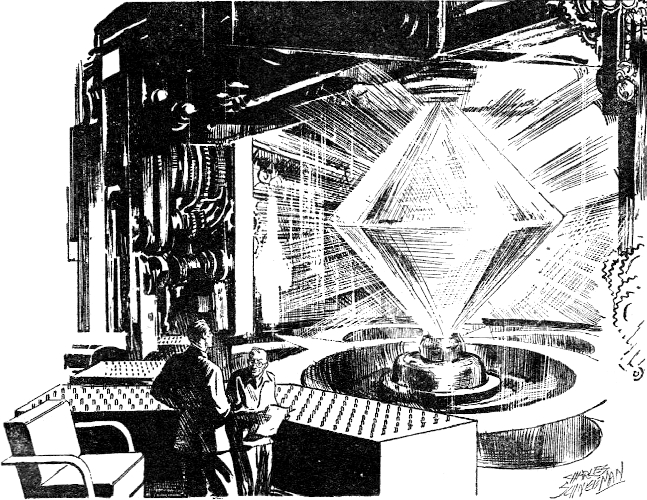 That bam-bam-bam I told you about came from the very center of the room. There was a crystal octahedron maybe ten feet high, nipped between vertical axes above and below. It was spinning slowly so that it looked jerky, and the vibration was the sound of the motors that turned it. From way high up there were shafts of light projected at it. The slow turning facets caught those beams and shattered them and sent them dancing through the room. Boys—it was really sensational.
