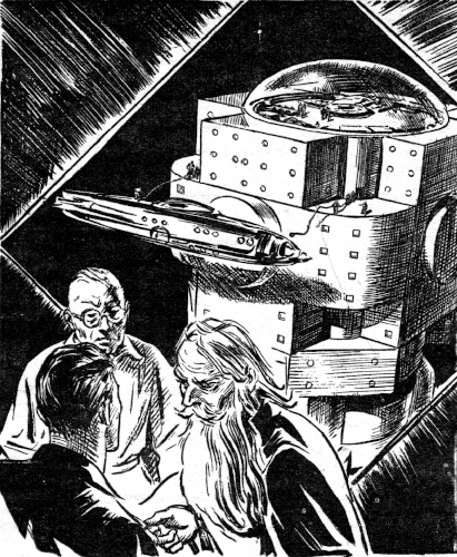 So I stepped his way and we went weaving through the clock-works to a desk at one side of the room. There were half a dozen chairs behind it and he seated me alongside himself. The flat top of the desk was banked with small tabs and push buttons so that it looked like a stenotype. He pressed one stud and the room darkened. He pressed another and the bam-bam quickened until it was a steady hum. The octahedron crystal whirled so quickly that it became a shadowy mist of light under the projectors.