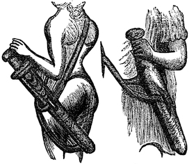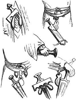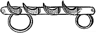 II. The stroke or blow which led to the cut would be seen exemplified in the felidæ, by the terrible buffet of the lion, by the clawing of the tiger and the bear, and by the swing of the trunk of the ‘half-reasoner with the hand.’ Man also would observe that the zebra and the quagga (so called from its cry, wag-ga, wag-ga[23]), the horse and the ass, the camel, the giraffe, and even the cow, defend themselves with the kick or hoof-blow; while the ostrich, the swan, and the larger birds of prey assault with a flirt or stroke of the wing. The aries or sea-ram (Delphinus orca) charges with a butt. The common whale raises the head with such force that it has been held capable of sinking a whaler: moreover, this mammal uses the huge caudal fin or tail in battle with man and beast; for instance, when engaged with the fox-shark or thresher (Carcharias vulpes).[24] These, combined with the force of man’s doubled fist, would suggest the ‘noble art’ of boxing: it dates from remote antiquity; witness the cestus or knuckle-duster of the classics, Greeks, Romans, and Lusitanians. So far from being confined to Great or Greater Britain, as some suppose, it is still a favourite not only with the Russian peasants, but also with the 8Hausas, Moslem negroids who did such good service in the Ashanti war. A curious survival of the feline armature is the Hindu’s Wágh-nakh. Following Demmin, Colonel A. Lane Fox[25] was in error when he described this ‘tiger’s-claw’ as ‘an Indian weapon of treachery belonging to a secret society, and invented about a.d. 1659.’ Demmin[26] as erroneously attributes the Wágh-nakh to Sívají, the Prince of Maráthá-land in Western India, who traitorously used it upon Afzal Khan, the Moslem General of Aurangzeb, sent (a.d. 1659) to put down his rebellion.[27] A meeting of the chiefs was agreed upon, and the Moslem, quitting his army, advanced with a single servant; he wore a thin robe, and carried only a straight sword. Sívají, descending from the fort, assumed a timid and hesitating air, and to all appearance was unarmed. But he wore mail under his flimsy white cotton coat, and besides a concealed dagger, he carried his ‘tiger’s-claw.’ The Khan looked with contempt at the crouching and diminutive ‘mountain rat,’ whom the Moslems threatened to bring back in cages; but, at the moment of embracing, the Maráthá struck his Wágh-nakh into his adversary’s bowels and despatched him with his dagger. The Wágh-nakh in question is still kept as a relic, I am told, by the Bhonslá family.[28] Outside the hand you see nothing but two solid gold rings encircling the index and the minimus; these two are joined inside by a steel bar, which serves as a connecting base to three or four sharp claws, thin enough to fit between and to be hidden by the fingers of a half-closed hand. The attack is by 9ripping open the belly: and I have heard of a poisoned Wágh-nakh which may have been suggested by certain poison rings in ancient and mediæval Europe.[29] The date of invention is absolutely unknown, and a curious and instructive modification of it was made by those Indians-in-Europe, the Gypsies.