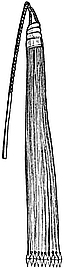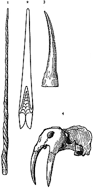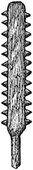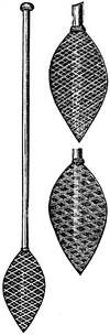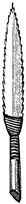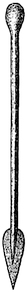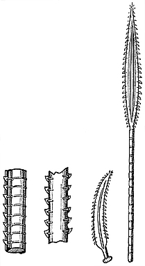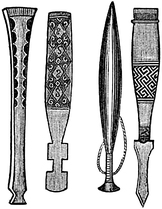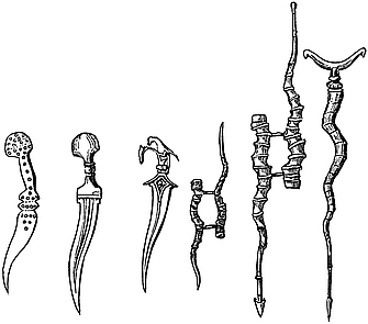 The pugnacious and voracious little ‘stickleback’ (Gasterosteus) is similarly provided. The ‘bull-head’ (Cottus diceraus, Pallas[32]) bears a multibarbed horn on its dorsum, exactly resembling the spears of the Eskimos and the savages of South America and Australia. The yellow-bellied ‘surgeon’ or lancet-fish (Acanthurus) is armed, in either ocean, with a long spine on each side of the tail; with this lance it defends itself dexterously against its many enemies. The Naseus fronticornis (Lacépède) bears, besides the horn-muzzle, trenchant spear-formed blades in the 11pointed and serrated tail. The sting-fish or adder-pike (Trachinus vipera) has necessitated amputation of the wounded limb: the dorsals, as well as the opercular spines, have deep double grooves in which the venomous mucous secretion is lodged—a hint to dagger-makers. The sting-rays (Raia trygon and R. histrix[33]) twist the long slender tail round the object of attack and cut the surface with the strong notched and spiny edge, inflicting a wound not easily healed. The sting, besides being poisonous, has the especial merit of breaking off in the wound: it is extensively used by the savages of the Fiji, the Gambier, and the Pellew Islands, of Tahiti, Samoa, and many of the Low Islands.[34] These properties would suggest poisoned weapons which cannot be extracted. Such are the arrows of the Bushman, the Shoshoni, and the Macoinchi of Guiana, culminating in the highly-civilised stiletto of hollow glass.