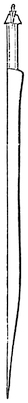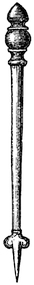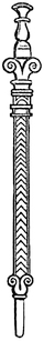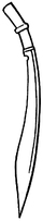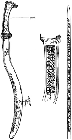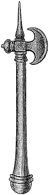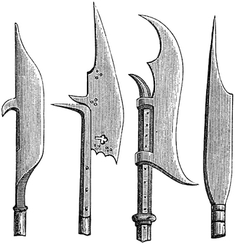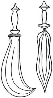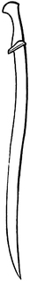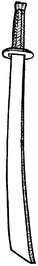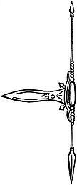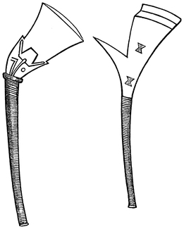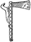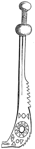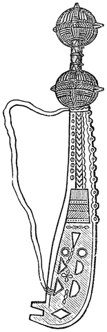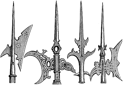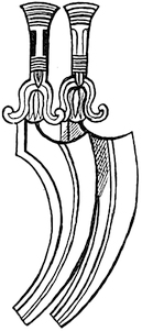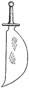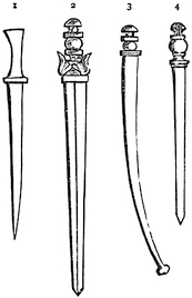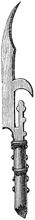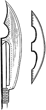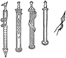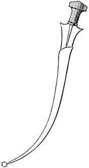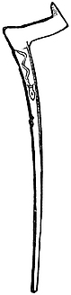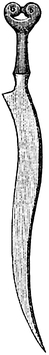 The other German blade was single-edged and curved: it was a semi-Spatha, half the size of the Spatha, and it hung to the warrior’s right side. This weapon was probably the Sahs,[996] Seax, Sax, the favourite of the Saxons; also called Breitsachs and Knief (knife), and at later times, scramasaxus, Scramasax.[997] A large iron knife, with a yataghan curve, it was used 273either as a dirk or a missile. Some of these throw-Swords had a hook by way of pommel for better securing the hilt. The Schwertstab (Sword-staff) or Prachtaxt is described and figured by Jähns[998] as a kind of dolch[999] or dagger, attached to a long hollow metal haft, like that of a Persian war-axe. It is a rare article, and its rarity leads him to believe it was symbolic of the Saxnot (Sword-god) Zio, Tui, or Tuisco. Dr. Evans[1000] considers the weapon ‘a kind of halberd or battle-axe;’ others, a commander’s staff or bâton of honour; but the article is too widely used to be so explained. A fine specimen of the Schwertstab with handle and blade of bronze, was found at Årup in Scania, and an analogous form is shown in a Chinese blade.