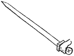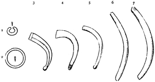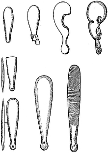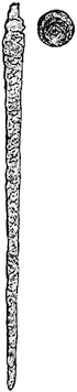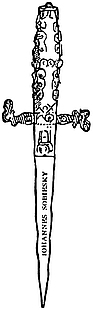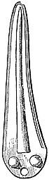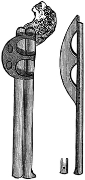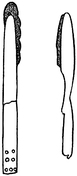 The handle of the leaf-blade usually consisted of plates of horn, bone, or wood, riveted on either side of the hilt plate. The latter differs considerably in form, and in the number and arrangement of the rivets, by which the covering material was attached. Some have as many as thirteen piercings; they seldom, however, exceed seven. The apertures are either round holes or longitudinal slots of greater or lesser extent. There is a pronounced swelling in the grip when the tang is of full length. At the end it expands, evidently for the purpose of receiving a pommel formed by the material of the hilt. This tang end is a fish-tail more or less pronounced. One illustrated by Dr. Evans[1035] has two spirals attached to the base of the hilt, a rare form in England, but common in Scandinavia. Another[1036] pommel-end has a distinct casting, ‘and is very remarkable on account of the two curved horns extending from it, which are somewhat trumpet-mouthed, with a projecting cone in the centre of each.’ This manilla-end appears to me Irish.