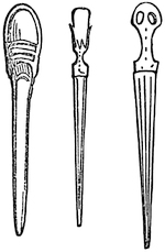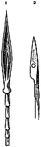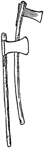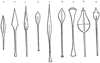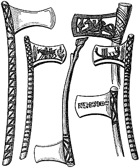 We have the authority of Tacitus for the fact that the Germans of his day did not (like the Kelts)[981] affect the short straight sword: ‘rari ... gladiis utuntur.’[982] The national weapon was the spear[983] of a peculiar kind; ‘hastas vel ipsorum vocabulo frameas gerunt angusto et brevi ferro.’ The derivation of the word and the nature of the weapon are still undetermined.[984] Modern authorities hold the oldest framée to have been a long spear, with a head of stone, copper, bronze, or iron, shaped like a Palstab or an expanding ‘Celt;’ and Demmin[985] shows the same broad shovel-shaped base in the Abyssinian lance. It was either thrown or thrust, and the weapon must not be confounded with the enormous hastæ of 271Tacitus,[986] in whose day the Roman spear was fourteen feet long. It was a formidable weapon; those who knew it spoke with awe of ‘illam cruentam victricemque frameam’; and the Germans long preserved the saying ‘one spear is worth two Swords.’ Yet, strange to say, it is rarely found in graves, where the throwing-axe of stone and bronze, pierced or unpierced, one-edged or two-headed (πέλεκυς ἀμφιστόμος, bipennis), is so common.