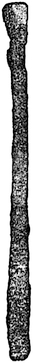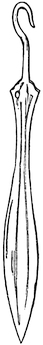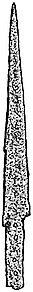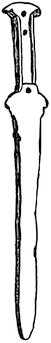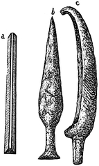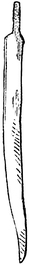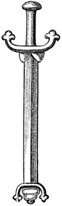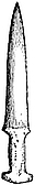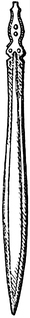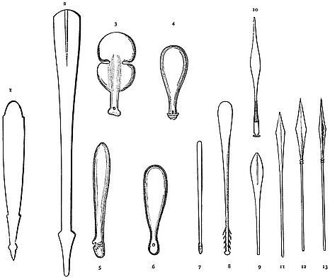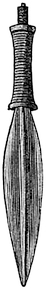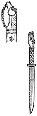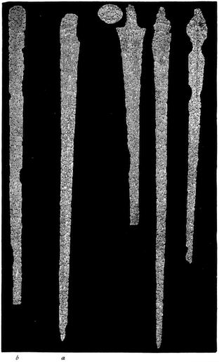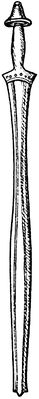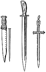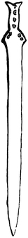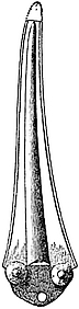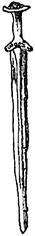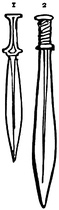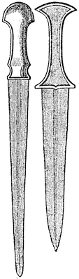 Iron, according to Tacitus,[987] was known to the Germans, but was not common. His statement is supported by ‘finds’ in the old tumuli and stone rings, known as Riesenmauer, Hünnenringe,[988] Teufelsgraben, Burgwälle, and others. The myths of giants, dwarfs, and serpents suggest an Eastern origin for the metal. Bronze blades, on the other hand, are common. A typical specimen from the Elbe valley in the Klemm collection is thus described by Jähns.[989] The whole weapon is 23·25 centimètres long, the blade being 18·5, with a maximum breadth of 1·625. The shape is conical, tapering to the point; a high and rounded mid-rib is subtended on either side by a deepened line which runs to the end. Between shoulders and blade the front view shows on either side a crescent-shaped notch. The grip is narrower at the middle, where there is a long oval slit for making fast the handle; and there are two rivet holes on either side of the shoulders, whence the mid-rib springs. It shows no pommel, the place being taken by a shallow crutch.