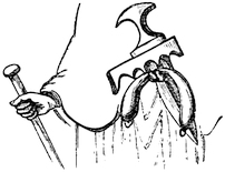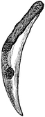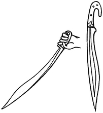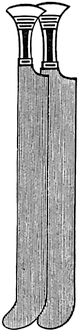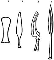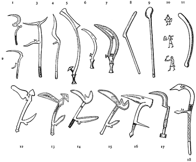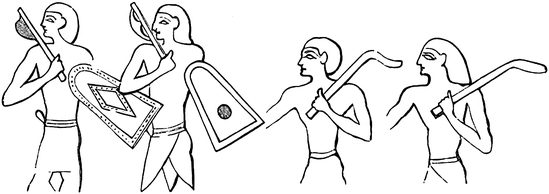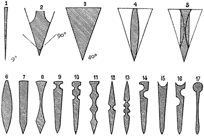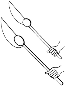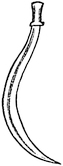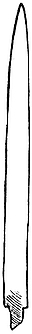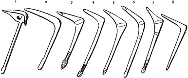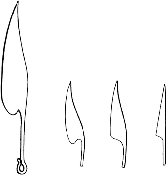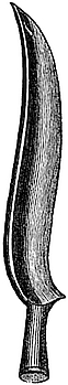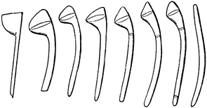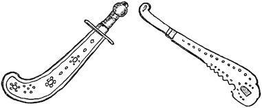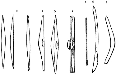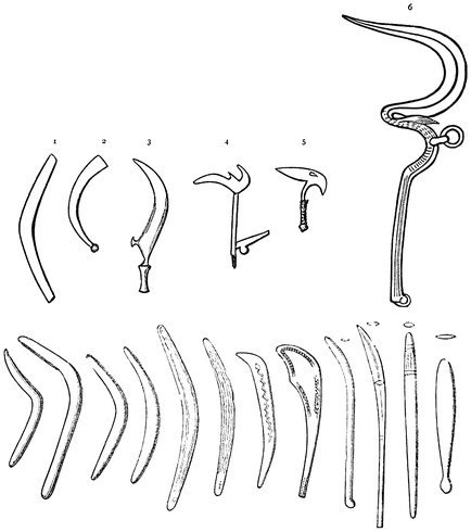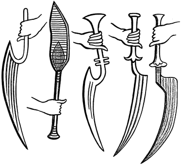 IV. The first idea of a trenchant or cutting instrument would be suggested by various reeds and grasses; their silicious leaves at certain angles cleave to the bone, as experience has taught most men who have passed through a jungle of wild sugar-cane. When full-grown the plants stand higher than a man’s head, and the flint-edged leaves disposed in all directions suggest a labyrinth of sword-blades. Thus the Mawingo-wingo (Pennisetum Benthami), like the horse-tail or ‘shave-grass’ of Spain, was used as knives by the executioners of Kings Sunna and Mtesa of Uganda, when cutting the human victims to pieces.[38] Of the same kind are the ‘sword-grass’ and the ‘bamboo-grass.’ Many races, especially the Andamanese and the Polynesian Islanders, make useful blades of the split and sharpened bamboo: they are fashioned from the green plant, and are dried and charred to sharpen the edge. Turning to the animal world, the cassowary tears with a forward cut, and the wounded coot scratches like a cat. The ‘old man kangaroo,’ with the long nail of the powerful hind leg, has opened the stomach of many a staunch hound. The wild boar attacks with a thrust, followed by a rip, cutting scientifically from below upwards. This, as will appear, is precisely the plan adopted by certain ancient forms of sabre, Greek and barbarian, the cutting edges being inside, not outside, the curve. I may add that the old attack is one of our latest improvements in broadsword exercise.[39]