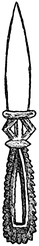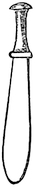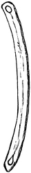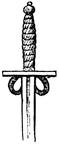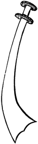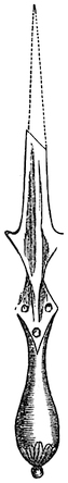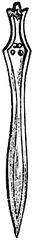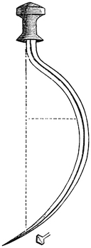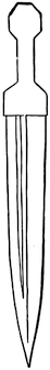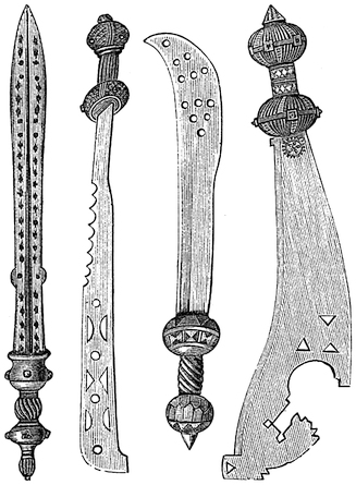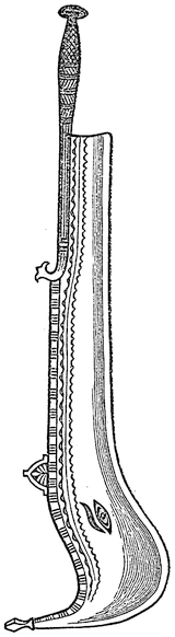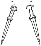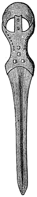 The bronze Swords of the ancient Britons are of two kinds: the leaf-blade and the Rapier, both well cast. The total length of the former is about two feet, the extremes being sixteen inches to thirty, and in rare cases more. The blades are uniformly rounded, but with the part next the edge slightly drawn down so as to form a shallow fluting. The breadth appears greatest at the third near the point, and this would add to the facility of unsheathing. In almost all cases they are strengthened by a rounded mid-rib more or less bold; or they show ridges, with and without beading, or parallel lines that run along the whole blade or the greater part near the edges. Some combine mid-rib and ridges. The shoulders are either 278plain, notched, or flanged. In rare instances the outer part of the hilt is of bronze: Dr. Evans engraves[1034] a specimen of this kind. The total length of the weapon is twenty-one inches, of which the globular pommel and the grip, made for a large hand, occupy five. The hilt has the appearance of being cast upon the blade: it seems to have been formed of bronze of the same character, and there are no rivets by which the two castings could be attached. The shallow crescent, whose hollow faces the mid-rib (fig. 293), is a characteristic feature, and endures for ages in the northern bronzes.